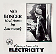 One of the claims made for electricity was that it would save work in the home. Publicity issued by the Electrical Development Association during the 1920s frequently promoted this idea, as in this quotation from an EDA pamphlet: "What is the stroke of magic which for the last few years has been transforming household tasks, formerly so burdensome, into a part of the daily routine cheerfully undertaken by mistress or maid? Watch the keen interest of women in domestic labour aid appliances at any Home Exhibition. You will discover that the little electric motor is largely responsible for this welcome change. Indeed, Electricity comes as a timely solution of the servant and other problems, which threatened to disturb that most potent factor in civilisation -- THE HOME; electricity provides the modern housewife with a perfect servant -- clean, silent, economical. What used to be the labor (hard labour) of hours is now accomplished almost without effort in a matter of minutes."